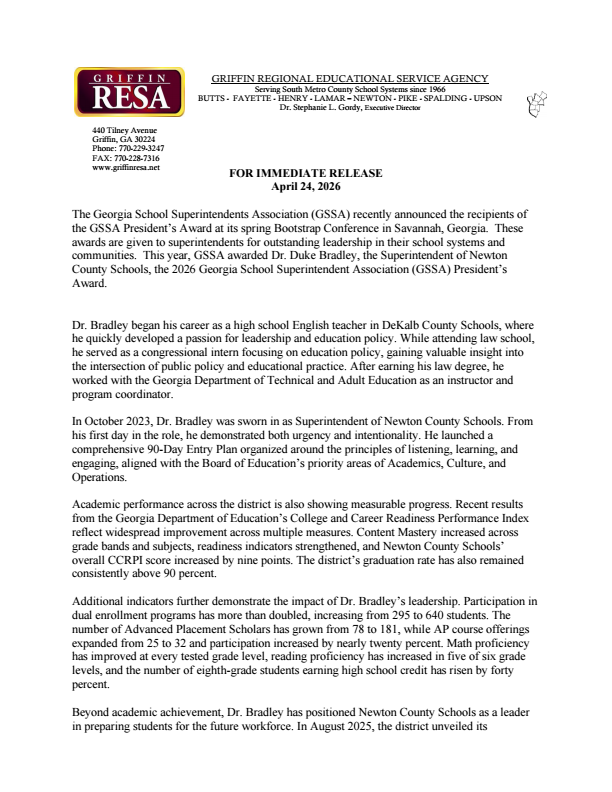 The Georgia School Superintendents Association (GSSA) recently announced the recipients of the GSSA President’s Award at its spring Bootstrap Conference in Savannah, Georgia. These awards are given to superintendents for outstanding leadership in their school systems and communities. This year, GSSA awarded Dr. Duke Bradley, the Superintendent of Newton County Schools, the 2026 Georgia School Superintendent Association (GSSA) President’s Award.